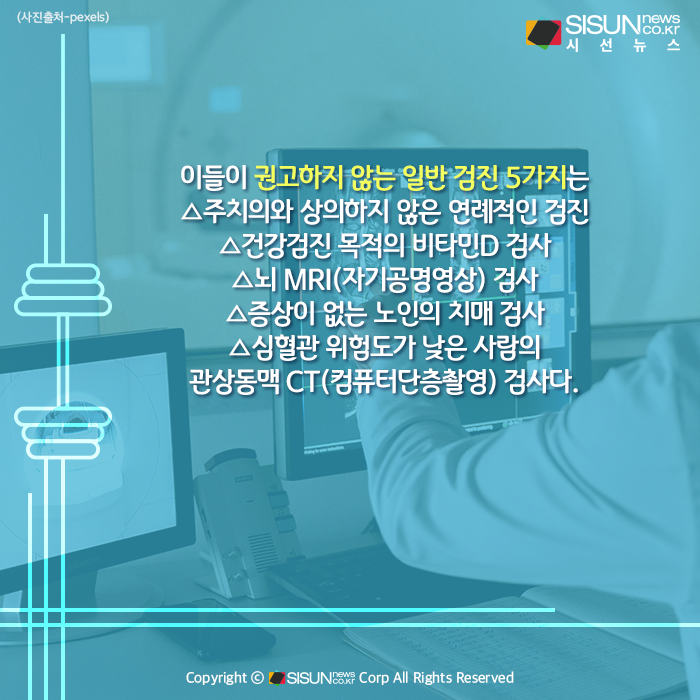 이들이 권고하지 않는 일반 검진 5가지는 △주치의와 상의하지 않은 연례적인 검진 △건강검진 목적의 비타민D 검사 △뇌 MRI(자기공명영상) 검사 △증상이 없는 노인의 치매 검사 △심혈관 위험도가 낮은 사람의 관상동맥 CT(컴퓨터단층촬영) 검사다.
