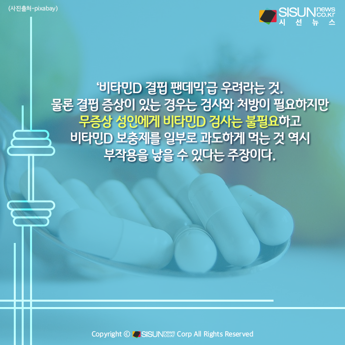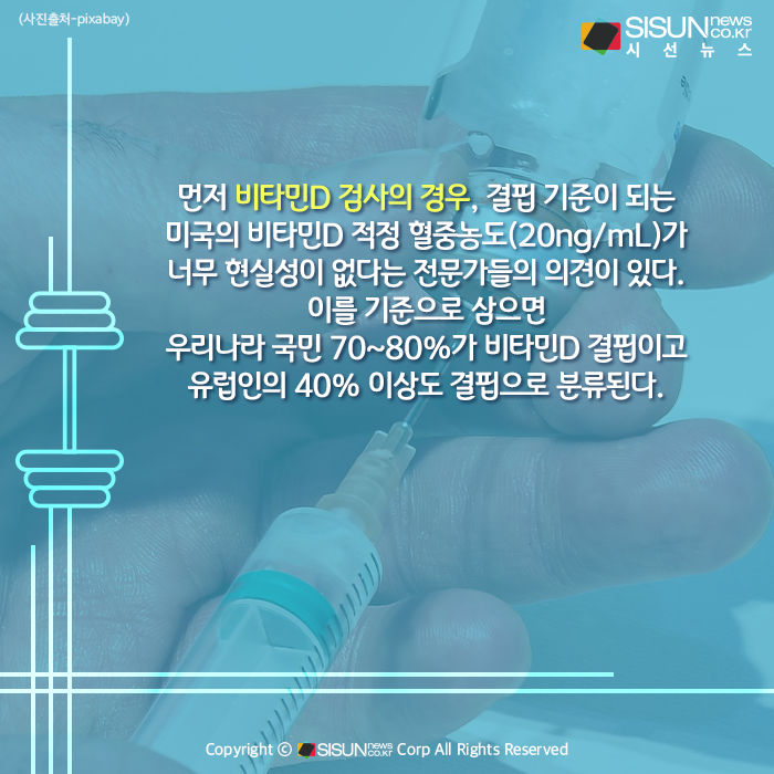 먼저 비타민D 검사의 경우, 결핍 기준이 되는 미국의 비타민D 적정 혈중농도(20ng/mL)가 너무 현실성이 없다는 전문가들의 의견이 있다. 이를 기준으로 삼으면 우리나라 국민 70~80%가 비타민D 결핍이고 유럽인의 40% 이상도 결핍으로 분류된다. ‘비타민D 결핍 팬데믹’급 우려라는 것. 물론 결핍 증상이 있는 경우는 검사와 처방이 필요하지만 무증상 성인에게 비타민D 검사는 불필요하고 비타민D 보충제를 일부로 과도하게 먹는 것 역시 부작용을 낳을 수 있다는 주장이다.