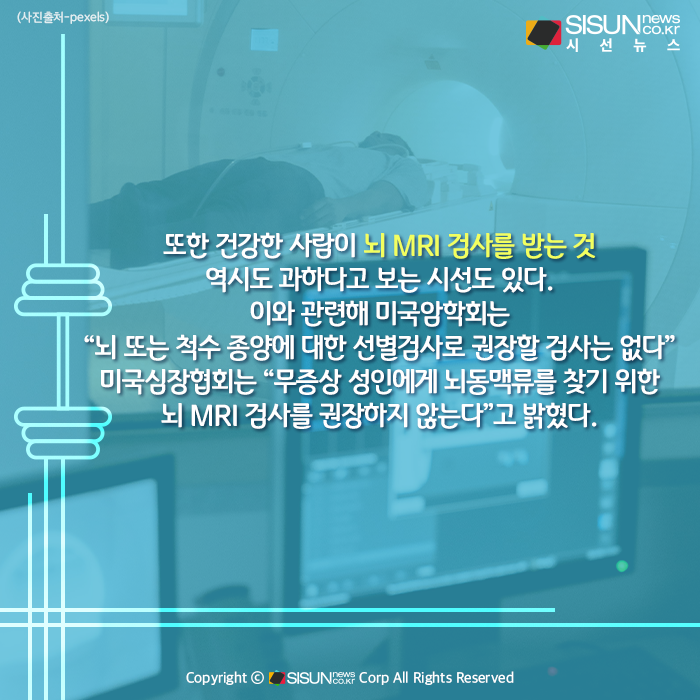 또한 건강한 사람이 뇌 MRI 검사를 받는 것 역시도 과하다고 보는 시선도 있다. 건강한 사람이 뇌종양이나 뇌 질환을 찾으려고 이 검사를 받지만 그 효과에 대한 근거가 부족하다는 것. 이와 관련해 미국암학회는 “뇌 또는 척수 종양에 대한 선별검사로 권장할 검사는 없다” 미국심장협회는 “무증상 성인에게 뇌동맥류를 찾기 위한 뇌 MRI 검사를 권장하지 않는다”고 밝혔다.