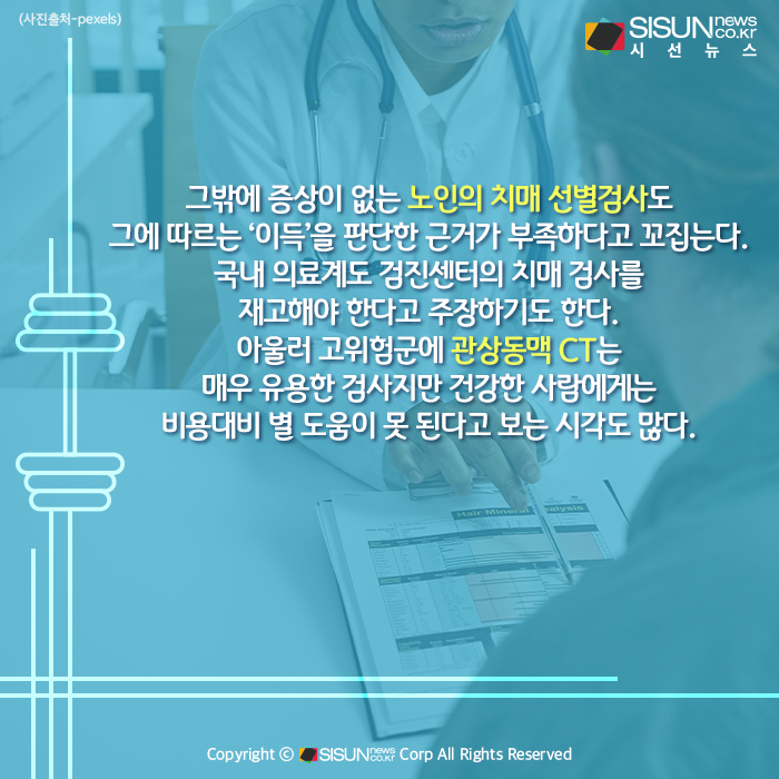 그밖에 증상이 없는 노인의 치매 선별검사도 그에 따르는 ‘이득’을 판단한 근거가 부족하다고 꼬집는다. 국내 의료계도 검진센터의 치매 검사를 재고해야 한다고 주장하기도 한다. 아울러 고위험군에 관상동맥 CT는 매우 유용한 검사지만 건강한 사람에게는 비용대비 별 도움이 못 된다고 보는 시각도 많다.
