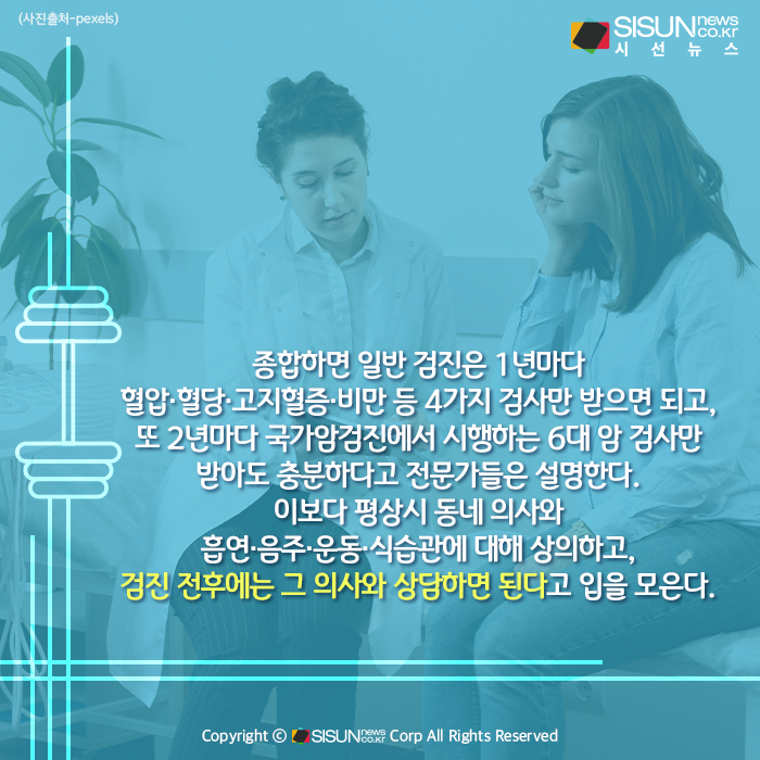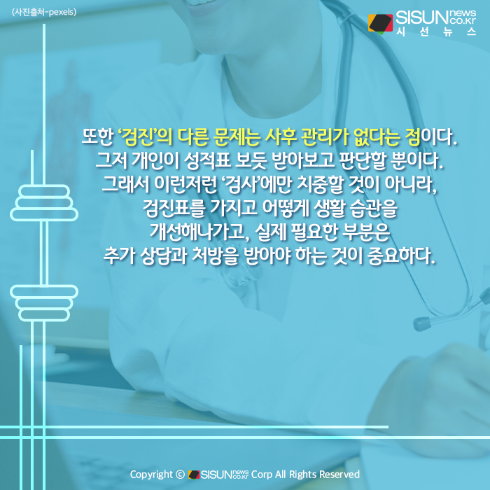 또한 ‘검진’의 다른 문제는 검사만 할 뿐 정작 사후 관리가 없다는 점이다. 그저 개인이 성적표 보듯 받아보고 판단할 뿐이다. 그래서 이런저런 ‘검사’에만 치중할 것이 아니라, 검진표를 가지고 어떻게 생활 습관을 개선해나가고, 실제 필요한 부분은 미루지 말고 가까운 병원에 방문해 그때그때 추가 상담과 처방을 받아야 하는 것이 중요하다.