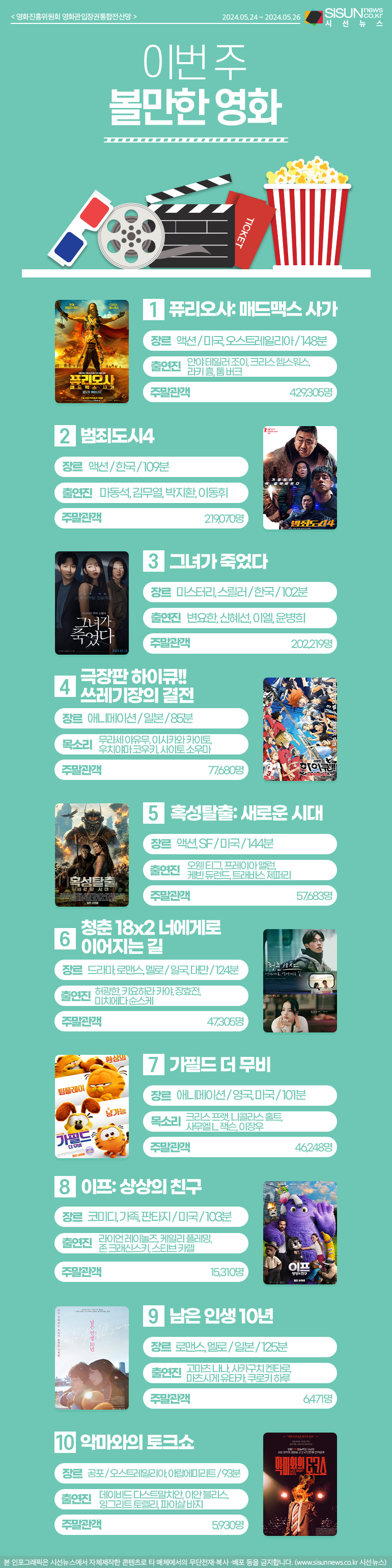 시선뉴스=김선희 proㅣ이번 주 볼만한 영화, 어떤 것들이 있을까요? 지난 2024년 05월 24일부터 2024년 05월 26까지 영화진흥위원회 영화관입장권통합전산망의 랭킹을 알려드립니다.