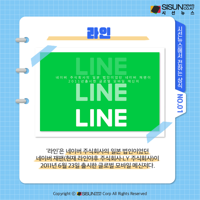 ‘라인’은 네이버 주식회사의 일본 법인이었던 네이버 재팬(현재 라인야후 주식회사·LY 주식회사)이 2011년 6월 23일 출시한 글로벌 모바일 메신저다. 라인 가입자들끼리 데이터 사용으로 국가나 이동통신사와 관계없이 무료 메시지, 무료 영상 및 음성 통화 서비스가 가능하며, 사진과 동영상 공유는 물론 음성 메시지와 연락처 등을 주고 받을 수도 있다. 우리나라의 ‘카카오톡’과 비슷한 개념이다.