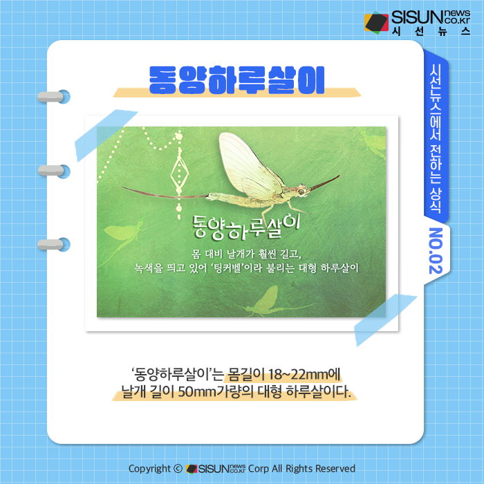 ‘동양하루살이’는 몸길이 18~22mm에 날개 길이 50mm가량의 대형 하루살이다. 몸 대비 날개가 훨씬 길고, 녹색을 띄고 있어 ‘팅커벨’이라는 별명이 붙었다. 하천이나 연못, 계곡 등 습기가 많은 곳 주변 땅속에서 굴을 파고 살며 수명은 수일 정도이고, 우리나라 전역에 서식하고 있다.
