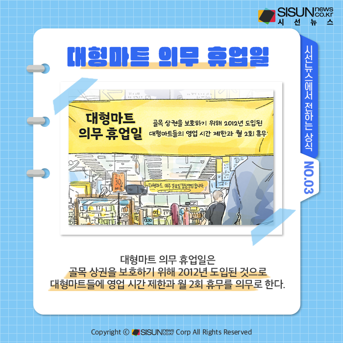 대형마트 의무 휴업일은 골목 상권을 보호하기 위해 2012년 도입된 것으로 대형마트들에 영업 시간 제한과 월 2회 휴무를 의무로 한다. 유통산업발전법 일부개정안에 따른 이 규제는 격주 일요일이면 크리스마스, 명절 전날 등에도 반드시 쉬어야 했기에 합리적이지 않다는 비판도 많았다.