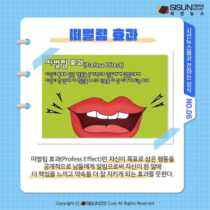 떠벌림 효과(Profess Effect)란 자신이 목표로 삼은 행동을 공개적으로 남들에게 알림으로써 자신이 한 말에 더 책임을 느끼고 약속을 더 잘 지키게 되는 효과를 뜻한다. ‘떠벌림 효과’ 는 1955년 도이치 박사와 게라드 박사가 실험을 통해 발표한 것으로, 실제 자신의 목표를 널리 떠벌리며 그 사실을 알게 된 주변 사람들과 대대적인 암묵적 약속을 하는 것을 통해 목표를 향해 한발 한발 나아가는 실천에 도움을 둔다.