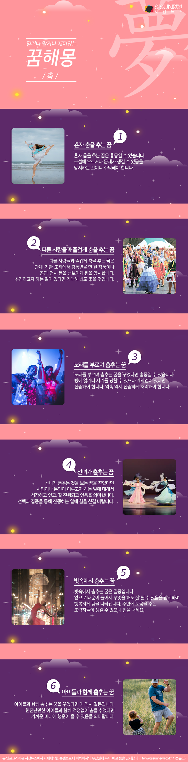 시선뉴스=박진아 기자 / 디자인=김선희 proㅣ예부터 꿈 해몽은 자신의 주변인의 미래를 예견하는데 중요한 역할을 해왔다. 물론 꿈 해몽이 정확하게 다 맞는 것은 아니지만 하루를 맞이하는 마음가짐에 적절한 참고를 해도 좋을 것이다. 오늘은 ‘춤’에 관련된 꿈 해몽을 소개한다.