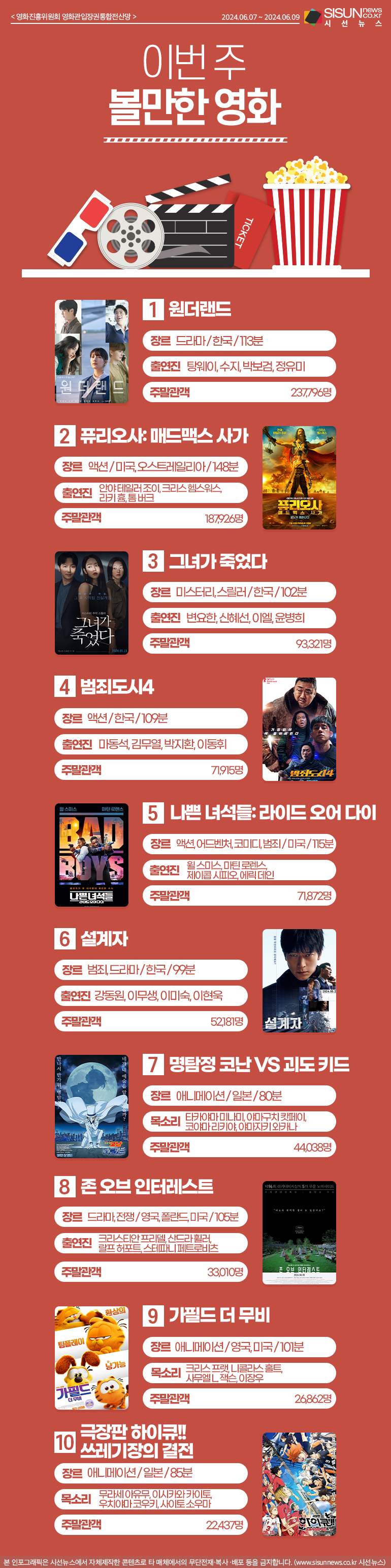 시선뉴스=김선희 proㅣ이번 주 볼만한 영화, 어떤 것들이 있을까요? 지난 2024년 06월 07일부터 2024년 06월 09까지 영화진흥위원회 영화관입장권통합전산망의 랭킹을 알려드립니다.