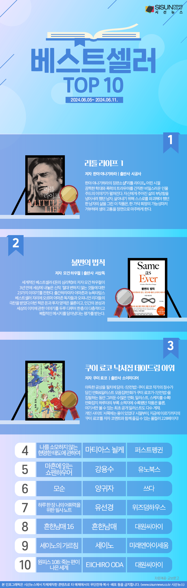 시선뉴스=김선희 proㅣ이번 주에는 어떤 책들이 독자들의 사랑을 받았을까요? 교보문고에서 2024년 06월 05일부터 06월 11일까지 영업점과 인터넷에서 도서와 eBook을 합산해 1주일 간 가장 많이 판매된 책 순위를 발표했습니다.