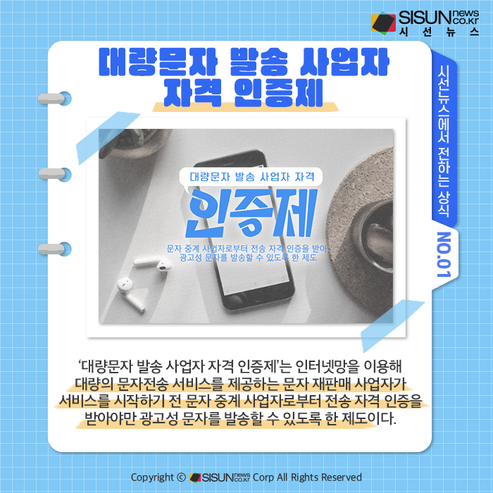 ‘대량문자 발송 사업자 자격 인증제’는 인터넷망을 이용해 대량의 문자전송 서비스를 제공하는 문자 재판매 사업자가 서비스를 시작하기 전 문자 중계 사업자로부터 전송 자격 인증을 받아야만 광고성 문자를 발송할 수 있도록 한 제도이다.
