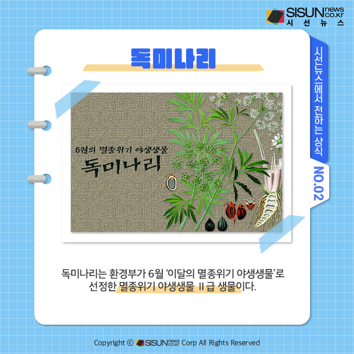 독미나리는 환경부가 6월 ‘이달의 멸종위기 야생생물’로 선정한 멸종위기 야생생물 Ⅱ급 생물이다. 무서운 이름과 달리 ‘독미나리’는 이로운 식물인데, 뿌리와 줄기에 시쿠톡신(cicutoxin)이라는 신경계 독을 가지고 있는 독미나리는 조선 시대에 독근근(獨芹根)으로 불리는 한약재로도 사용되었다.
