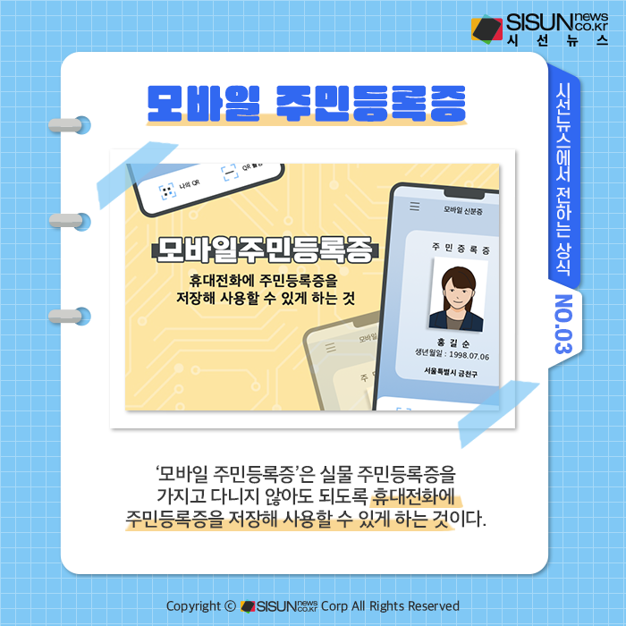 ‘모바일 주민등록증’은 실물 주민등록증을 가지고 다니지 않아도 되도록 휴대전화에 주민등록증을 저장해 사용할 수 있게 하는 것이다. ‘모바일 주민등록증이’ 도입되면 앞으로는 편의점이나 은행, 관공서 등에서 모바일 신분증 내 QR코드 스캔으로 신분 확인이 가능해진다.