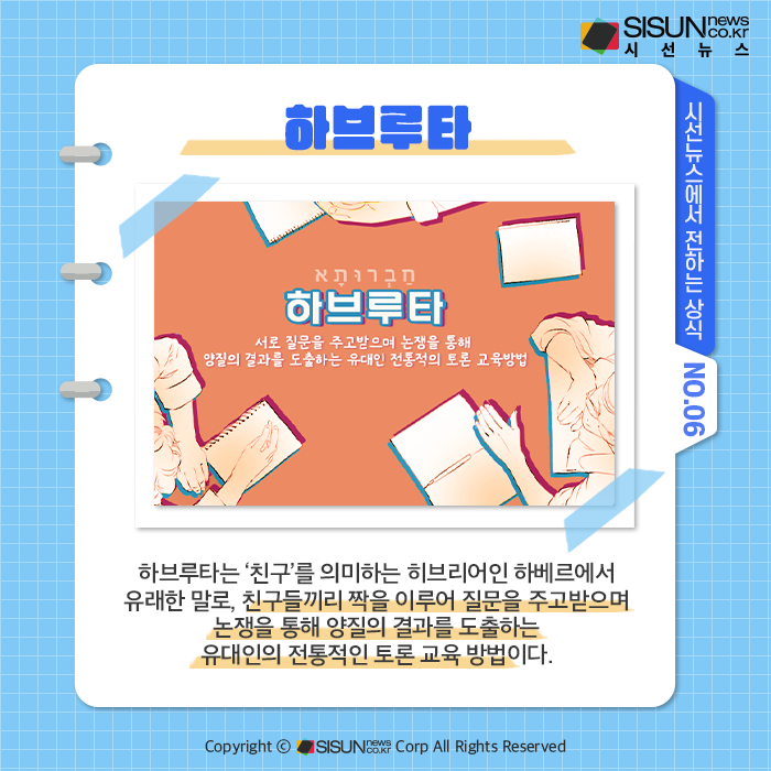 하브루타는 ‘친구’를 의미하는 히브리어인 하베르에서 유래한 말로, 친구들끼리 짝을 이루어 질문을 주고받으며 논쟁을 통해 양질의 결과를 도출하는 유대인의 전통적인 토론 교육 방법이다. ‘질문에서 답을 찾는다’는 말이 있듯이 하브루타는 서로 질문을 주고 받으며 논쟁과 소통을 통해 답을 찾아가는 과정으로, ‘답’만을 중요시 여기는 교육과는 달리 어떠한 지식을 다각적으로 이해해 나가며 해답을 찾는 ‘과정’을 중요하게 여긴다.