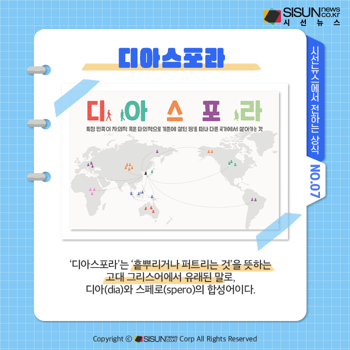 ‘디아스포라’는 ‘흩뿌리거나 퍼트리는 것’을 뜻하는 고대 그리스어에서 유래된 말로, 디아(dia)와 스페로(spero)의 합성어이다. 이는 팔레스타인을 떠나 세계 각지에 흩어져 살면서 유대교의 규범과 생활 관습을 유지하는 유대인이라는 뜻을 지닌다.