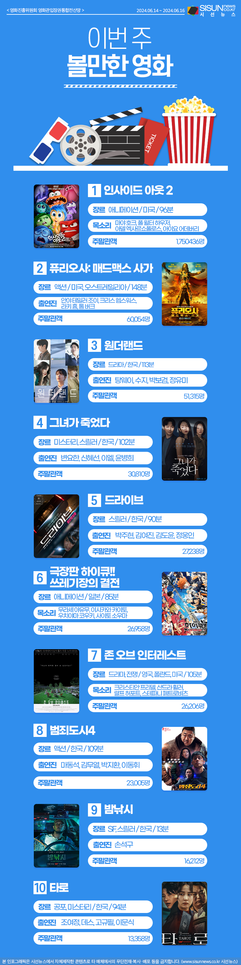 시선뉴스=김선희 proㅣ이번 주 볼만한 영화, 어떤 것들이 있을까요? 지난 2024년 06월 14일부터 2024년 06월 16까지 영화진흥위원회 영화관입장권통합전산망의 랭킹을 알려드립니다.