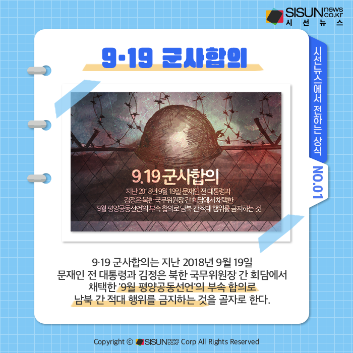 9·19 군사합의는 지난 2018년 9월 19일 문재인 전 대통령과 김정은 북한 국무위원장 간 회담에서 채택한 '9월 평양공동선언'의 부속 합의로 남북 간 적대 행위를 금지하는 것을 골자로 한다. 9·19 군사합의는 효력이 일부 정지된 상황이었다. 북한이 그간 9·19 군사합의를 위반하고 도발을 지속해왔으며, 작년 11월에는 일방적으로 합의 전면 파기를 선언한 바 있다. 같은 달 한국 정부도 9·19 군사합의 효력을 일부 정지했다.