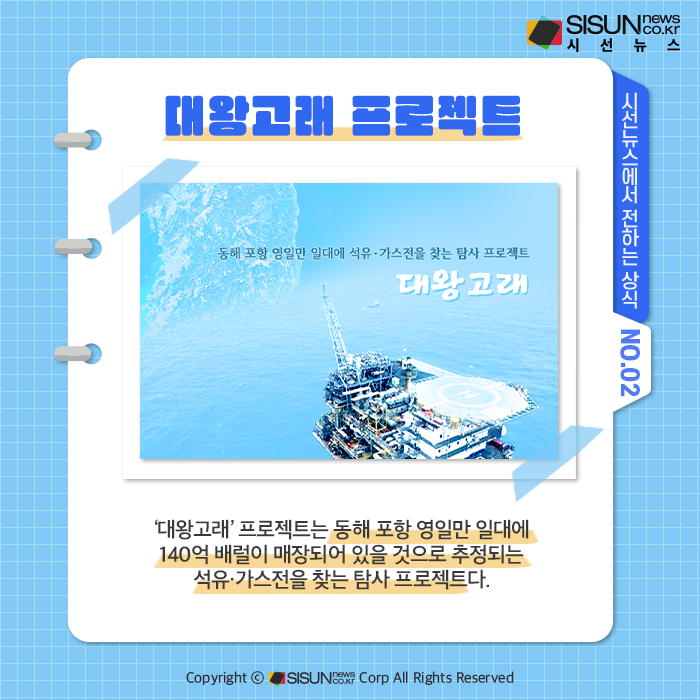 ‘대왕고래’ 프로젝트는 동해 포항 영일만 일대에 140억 배럴이 매장되어 있을 것으로 추정되는 석유·가스전을 찾는 탐사 프로젝트다. 윤석열 대통령이 지난 3일 포항 앞바다에 삼성전자 시가총액의 5배에 달하는 천연가스와 석유가 매장되어 있을 수 있다고 발표하며 우리나라가 산유국이 될 수 있을지 전 세계의 주목이 모이고 있다.