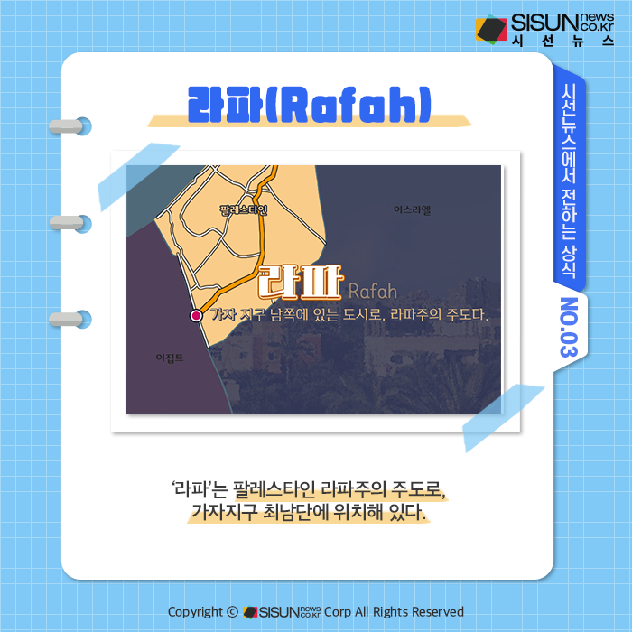‘라파’는 팔레스타인 라파주의 주도로, 가자지구 최남단에 위치해 있다. 라파는 팔레스타인과 이집트와의 국경에 맞닿아 있으며 현재 라파는 ‘국경검문소’를 통해 가자지구와 외부 세계를 이어주는 중요한 통로 역할을 하고 있다.
