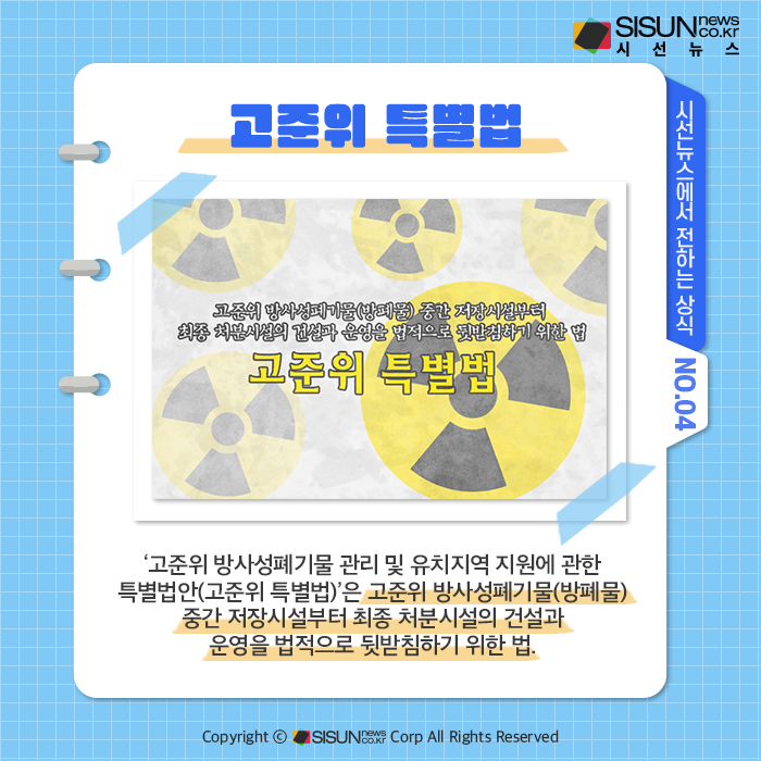 ‘고준위 방사성폐기물 관리 및 유치지역 지원에 관한 특별법안(고준위 특별법)’은 고준위 방사성폐기물(방폐물) 중간 저장시설부터 최종 처분시설의 건설과 운영을 법적으로 뒷받침하기 위한 법으로, 처분시설 확보를 추진할 행정위원회 신설과 유치지역 주민 지원에 대한 근거 규정을 담고 있다.