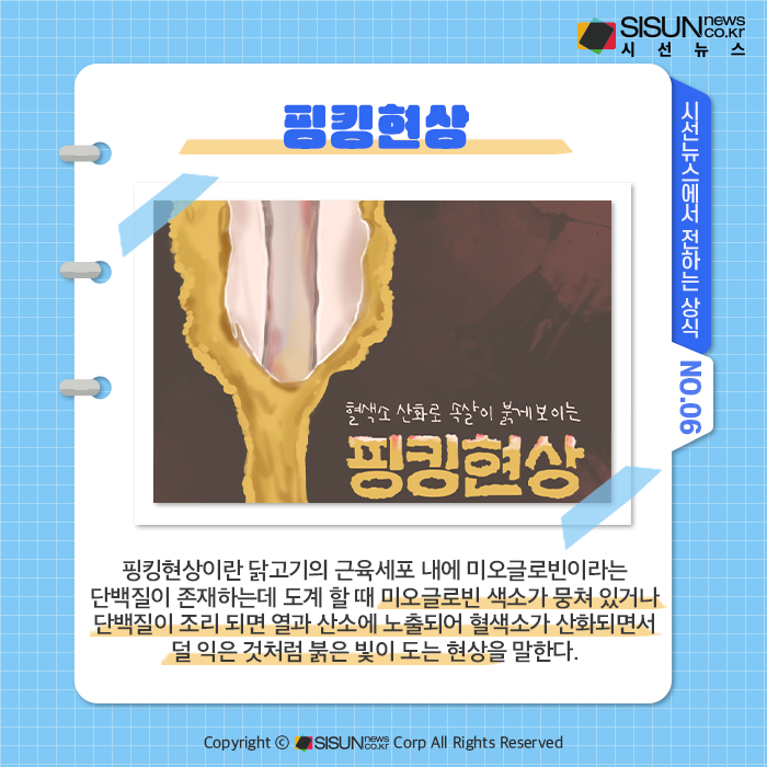 핑킹현상이란 닭고기의 근육세포 내에 미오글로빈이라는 단백질이 존재하는데 도계 할 때 미오글로빈 색소가 뭉쳐 있거나 단백질이 조리 되면 열과 산소에 노출되어 혈색소가 산화되면서 덜 익은 것처럼 붉은 빛이 도는 현상을 말한다. 쉽게 닭이 다 익었는데도 혈색소의 산화로 인해 속살이 붉게 보이는 것을 말한다.