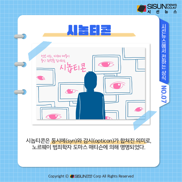 시놉티콘은 동시에(syn)와 감시(opticon)가 합쳐진 의미로, 노르웨이 범죄학자 도마스 매티슨에 의해 명명되었다. 이는 곧 중앙집권적이고 강력한 소수의 시선인 판옵티콘 뿐 아니라 사회에는 다수의 시선이 존재해 쌍방향 감시가 이루어진다는 뜻이다.