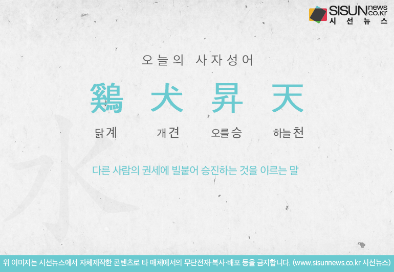 [닭 계, 개 견, 오를 승, 하늘 천]의 글자로 만들어진 사자성어 계견승천은 다른 사람의 권세에 빌붙어 승진하는 것을 이르는 말입니다.