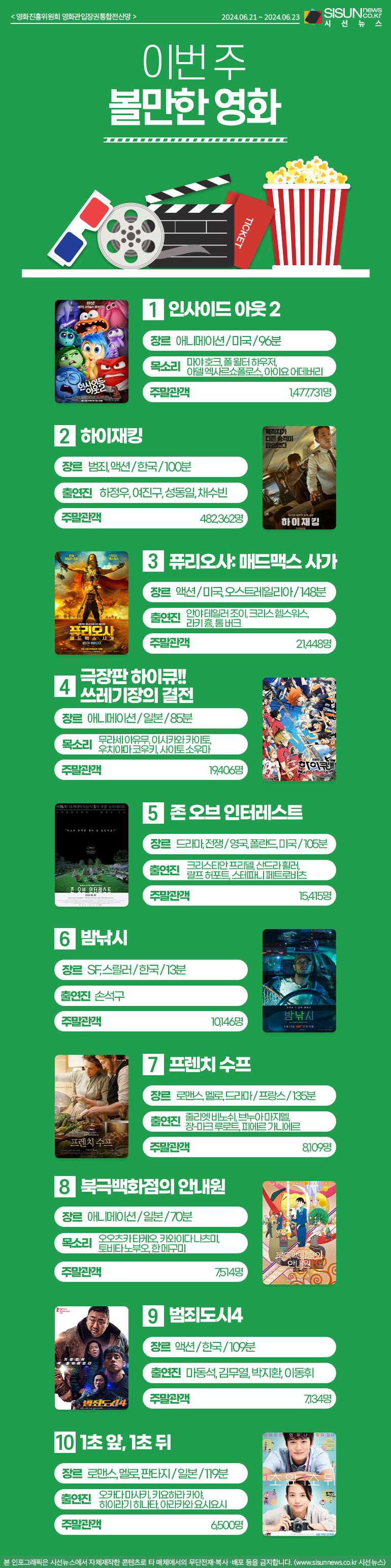 시선뉴스=김선희 proㅣ이번 주 볼만한 영화, 어떤 것들이 있을까요? 지난 2024년 06월 21일부터 2024년 06월 23까지 영화진흥위원회 영화관입장권통합전산망의 랭킹을 알려드립니다.