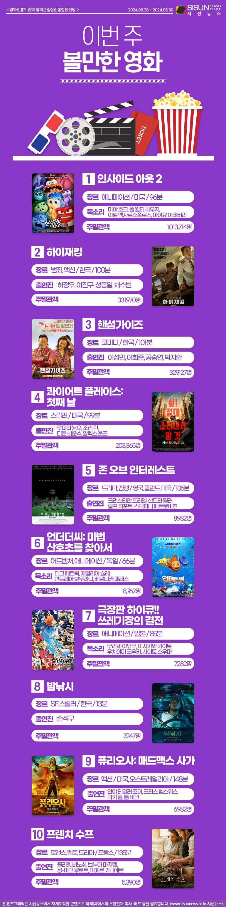 시선뉴스=김선희 proㅣ이번 주 볼만한 영화, 어떤 것들이 있을까요? 지난 2024년 06월 28일부터 2024년 06월 30까지 영화진흥위원회 영화관입장권통합전산망의 랭킹을 알려드립니다.