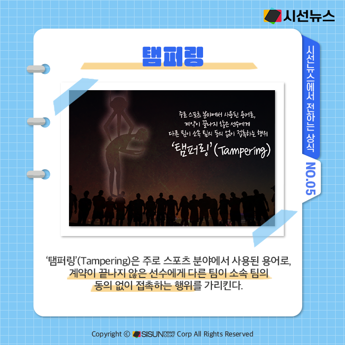 ‘탬퍼링’(Tampering)은 주로 스포츠 분야에서 사용된 용어로, 계약이 끝나지 않은 선수에게 다른 팀이 소속 팀의 동의 없이 접촉하는 행위를 가리킨다. 이는 ‘함부로 손을 대다’, ‘쓸데없는 참견을 하다’라는 의미의 영어 탬퍼(Tamper)에서 가져온 것으로, 프로 스포츠 분야에서 탬퍼링은 엄중한 규정 위반 행위이다.