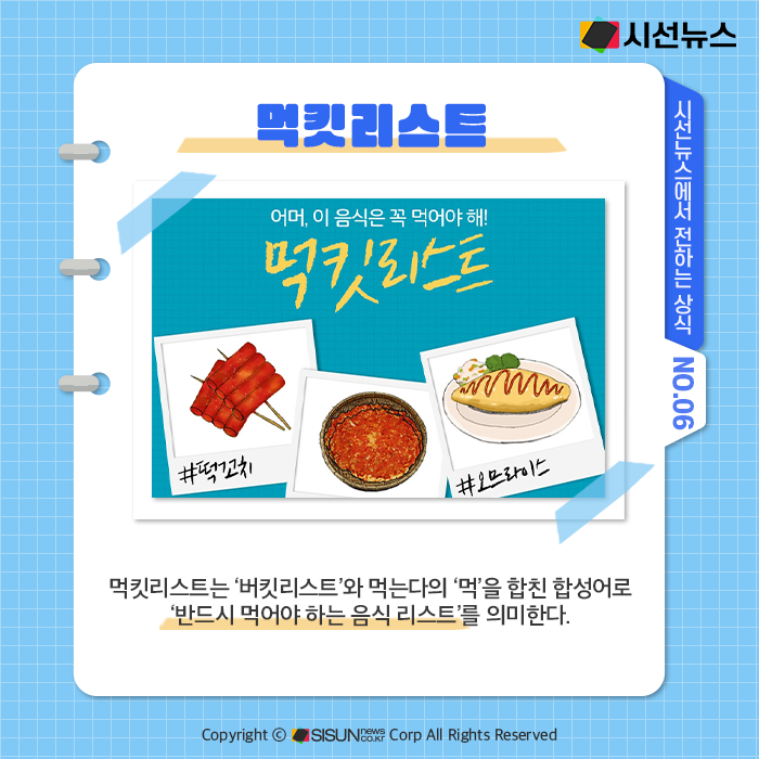 먹킷리스트는 ‘버킷리스트’와 먹는다의 ‘먹’을 합친 합성어로 ‘반드시 먹어야 하는 음식 리스트’를 의미한다. ‘죽기 전에 꼭 하고 싶은’이라는 버킷리스트와는 조금 다른 개념으로 ‘이곳에 오면 반드시 먹어야 하는’ 음식 리스트라 할 수 있겠다. 국내는 물론 해외여행이 일상화가 되어가면서 방문하는 지역의 특색 있는 음식이나 유명한 식당의 음식, 또는 살면서 먹어보지 못한 음식들을 반드시 먹어보겠다는 일념으로 작성하게 된다.