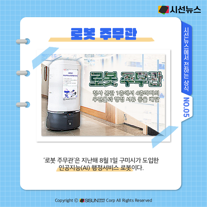 ‘로봇 주무관’은 지난해 8월 1일 구미시가 도입한 인공지능(AI) 행정서비스 로봇이다. 로봇 주무관은 공무원증을 부착하고 오전 9시부터 오후 6시까지 근무하며 청사 본관 1층에서 4층까지의 우편물과 행정 서류 등을 배달했고, 몸체에 달린 LCD 화면으로 다양한 시청 소식을 시청 방문객들에게 전했다.