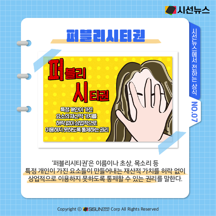 ‘퍼블리시티권’은 이름이나 초상, 목소리 등 특정 개인이 가진 요소들이 만들어내는 재산적 가치를 허락 없이 상업적으로 이용하지 못하도록 통제할 수 있는 권리를 말한다. 1953년 미국 제2연방항소법원에서 제롬 프랭크 판사가 해일런(Haelan) 사건 판결문에서 처음 사용했다.