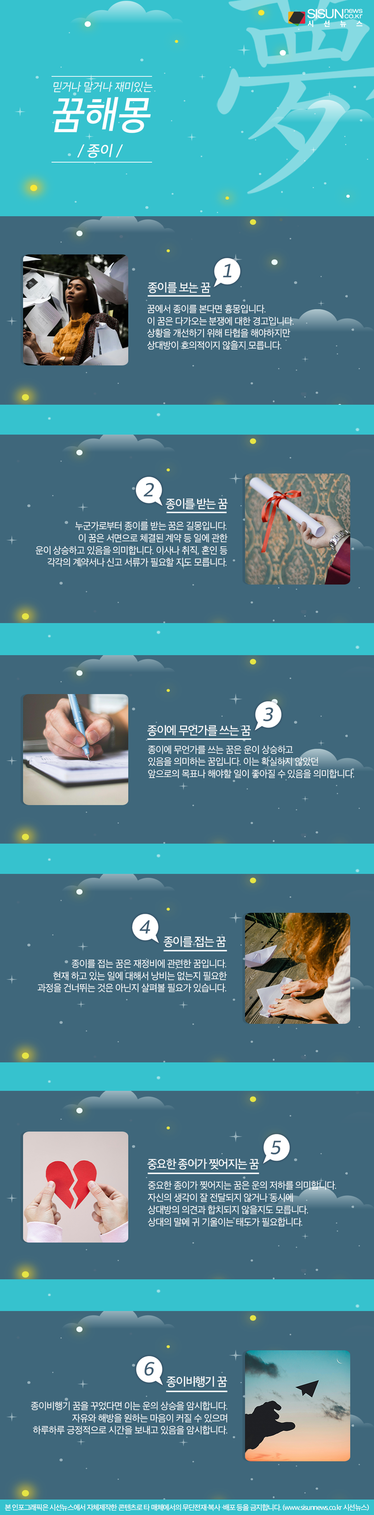 시선뉴스=박진아 기자 / 디자인=김선희 proㅣ예부터 꿈 해몽은 자신의 주변인의 미래를 예견하는데 중요한 역할을 해왔다. 물론 꿈 해몽이 정확하게 다 맞는 것은 아니지만 하루를 맞이하는 마음가짐에 적절한 참고를 해도 좋을 것이다. 오늘은 ‘종이 꿈’에 관련된 꿈 해몽을 소개한다.