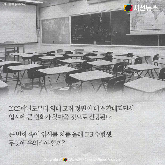 시선뉴스=심재민 기자 | 2025학년도부터 의대 모집 정원이 대폭 확대되면서 입시에 큰 변화가 찾아올 것으로 전망된다. 큰 변화 속에 입시를 치를 올해 고3 수험생, 무엇에 유의해야 할까?
