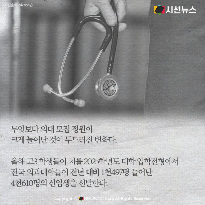 무엇보다 의대 모집 정원이 크게 늘어난 것이 두드러진 변화다. 올해 고3 학생들이 치를 2025학년도 대학 입학전형에서 전국 의과대학들이 전년 대비 1천497명 늘어난 4천610명의 신입생을 선발한다.