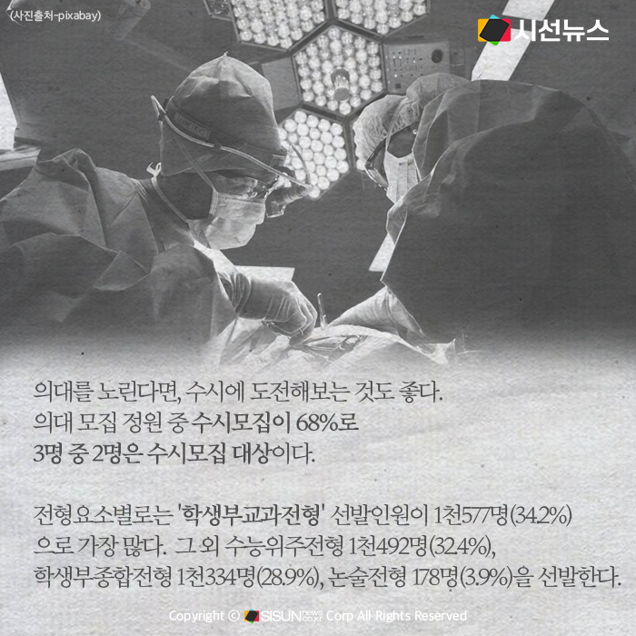 의대를 노린다면, 수시에 도전해 보는 것도 좋다. 의대 모집 정원 중 수시모집이 68%로 3명 중 2명은 수시모집 대상이다. 전형요소별로는 '학생부교과전형' 선발인원이 1천577명(34.2%) 가장 많다. 그 외 수능위주전형 1천492명(32.4%), 학생부종합전형 1천334명(28.9%), 논술전형 178명(3.9%)을 선발한다. 이처럼 학생부교과전형이 늘어남에 따라 각 대학이 '수능 최저기준'을 어떻게 설정할지도 관심이 쏠린다. 학생부교과전형은 고교 교과성적(내신성적)을 주요 전형요소로 하며, 학생부종합전형은 교과성적과 함께 창의적 체험활동을 비롯한 다양한 요소를 전형에 활용한다.
