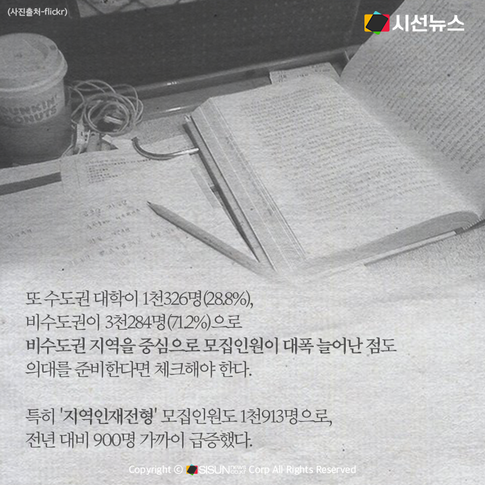 또 수도권 대학이 1천326명(28.8%), 비수도권이 3천284명(71.2%)으로 비수도권 지역을 중심으로 모집인원이 대폭 늘어난 점도 의대를 준비한다면 체크해야 한다. 특히 '지역인재전형' 모집인원도 1천913명으로, 전년 대비 900명 가까이 급증했다.