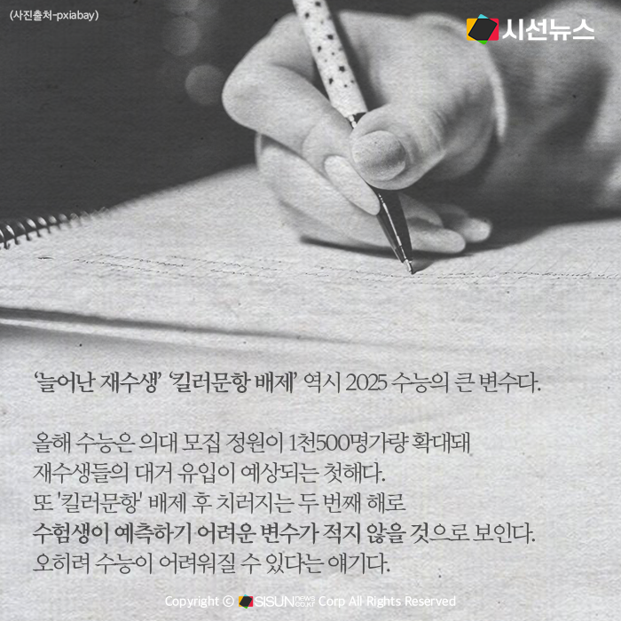 '늘어난 재수생' '킬러문항 배제' 역시 2025 수능의 큰 변수다. 올해 수능은 의대 모집 정원이 1천500명가량 확대돼 재수생들의 대거 유입이 예상되는 첫해다. 또 '킬러문항' 배제 후 치러지는 두 번째 해로 수험생이 예측하기 어려운 변수가 적지 않을 것으로 보인다. 오히려 수능이 어려워질 수 있다는 얘기다.