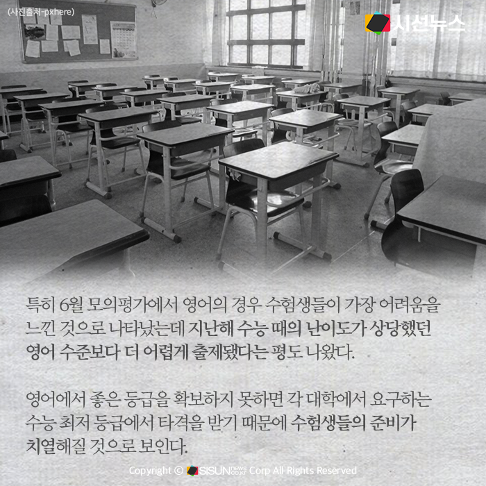 특히 6월 모의평가에서 영어의 경우 수험생들이 가장 어려움을 느낀 것으로 나타났는데 지난해 수능 때의 난이도가 상당했던 영어 수준보다 더 어렵게 출제됐다는 평도 나왔다. 영어에서 좋은 등급을 확보하지 못하면 각 대학에서 요구하는 수능 최저 등급에서 타격을 받기 때문에 수험생들의 준비가 치열해질 것으로 보인다.