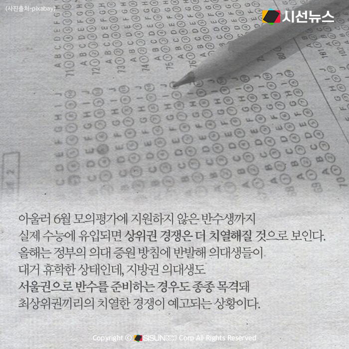 아울러 6월 모의평가에 지원하지 않은 반수생까지 실제 수능에 유입되면 상위권 경쟁은 상당히 치열해질 것으로 보인다. 올해는 정부의 의대 증원 방침에 반발해 의대생들이 대거 휴학한 상태인데, 지방권 의대생도 서울권으로 반수를 준비하는 경우도 종종 목격돼 최상위권끼리의 치열한 경쟁이 예고되는 상황이다.