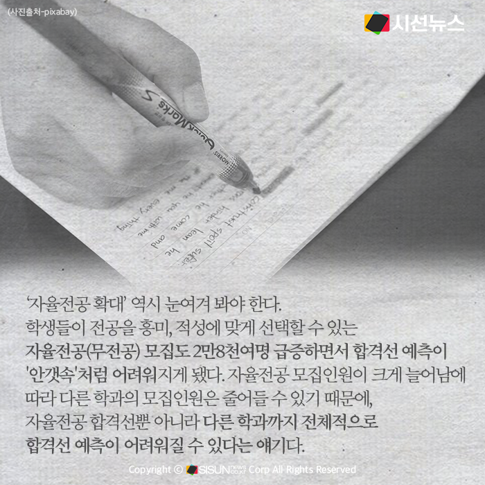 '자율전공 확대' 역시 눈여겨봐야 한다. 학생들이 전공을 흥미, 적성에 맞게 선택할 수 있는 자율전공(무전공) 모집도 2만8천여명 급증하면서 합격선 예측이 '안갯속'처럼 어려워지게 됐다. 자율전공 모집인원이 크게 늘어남에 따라 다른 학과의 모집인원은 줄어들 수 있기 때문에, 자율전공 합격선뿐 아니라 다른 학과까지 전체적으로 합격선 예측이 어려워질 수 있다는 얘기다.