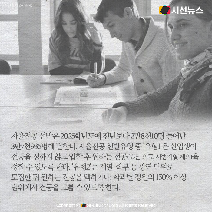 자율전공 선발은 2025학년도에 전년보다 2만8천10명 늘어난 3만7천935명에 달한다. 자율전공 선발유형 중 '유형1'은 신입생이 전공을 정하지 않고 입학 후 원하는 전공(보건·의료, 사범계열 제외)을 정할 수 있도록 한다. '유형2'는 계열·학부 등 광역 단위로 모집한 뒤 원하는 전공을 택하거나, 학과별 정원의 150% 이상 범위에서 전공을 고를 수 있도록 한다.
