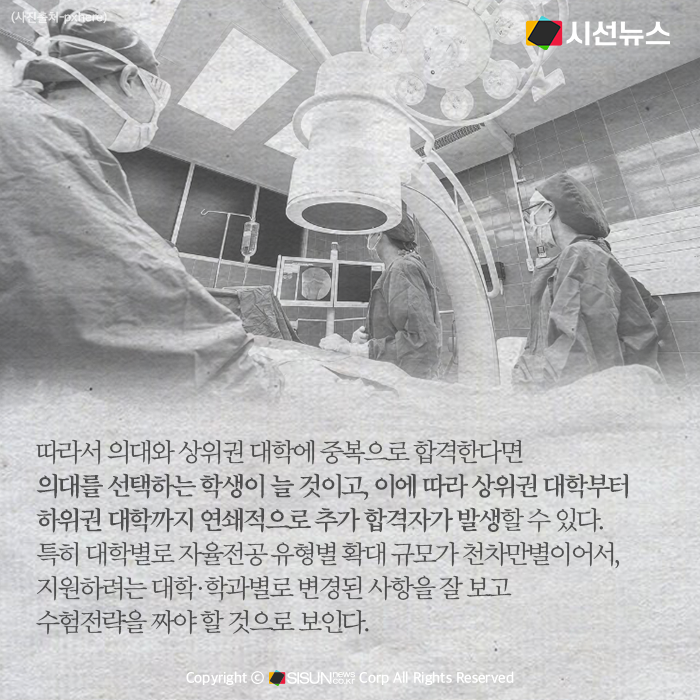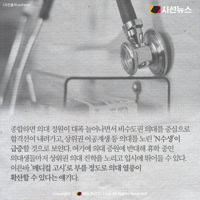 종합하면, 의대 정원이 대폭 늘어나면서 비수도권 의대를 중심으로 합격선이 내려가고, 상위권 이공계생 등 의대를 노린 'N수생'이 급증할 것으로 보인다. 여기에 의대 증원에 반대해 휴학 중인 의대생들마저 상위권 의대 진학을 노리고 입시에 뛰어들 수 있다. 이른바 '메디컬 고시'로 부를 정도로 의대 열풍이 확산할 수 있다는 얘기다.