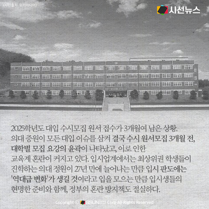 2025학년도 대입 수시모집 원서 접수가 3개월여 남은 상황. 의대 증원이 모든 대입 이슈를 삼켜 결국 수시 원서모집 3개월 전에서야 대학별 모집 요강의 윤곽이 나타났고, 이로 인한 교육계 혼란이 커지고 있다. 입시업계에서는 최상위권 학생들이 진학하는 의대 정원이 27년 만에 늘어나는 만큼 입시 판도에는 '역대급 변화'가 생길 것이라고 입을 모으는 만큼 입시생들의 현명한 준비와 함께, 정부의 혼란 방지책도 절실한 상황이다.