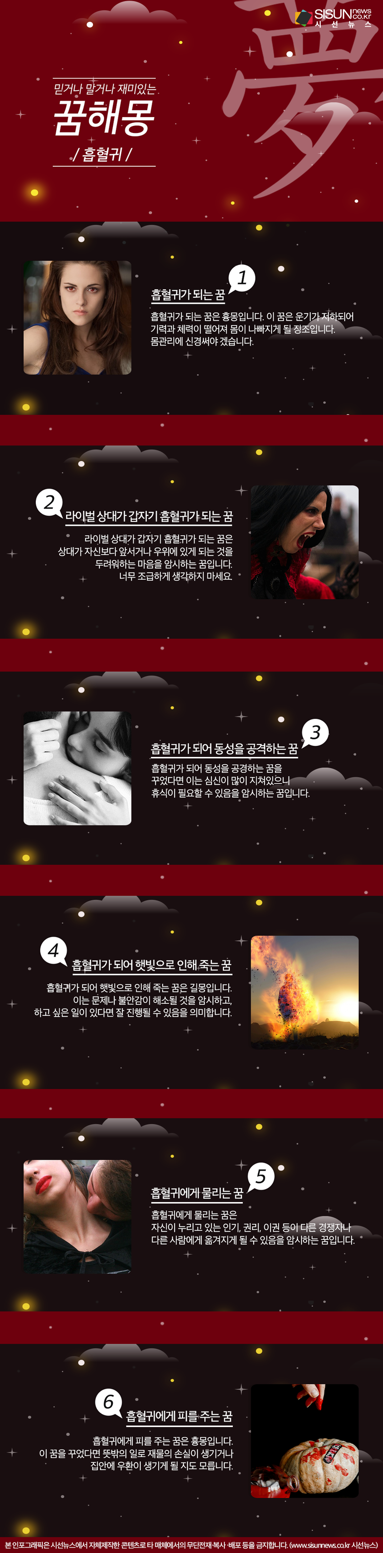 시선뉴스=박진아 기자 / 디자인=김선희 proㅣ예부터 꿈 해몽은 자신의 주변인의 미래를 예견하는데 중요한 역할을 해왔다. 물론 꿈 해몽이 정확하게 다 맞는 것은 아니지만 하루를 맞이하는 마음가짐에 적절한 참고를 해도 좋을 것이다. 오늘은 ‘흡혈귀 꿈’에 관련된 꿈 해몽을 소개한다.