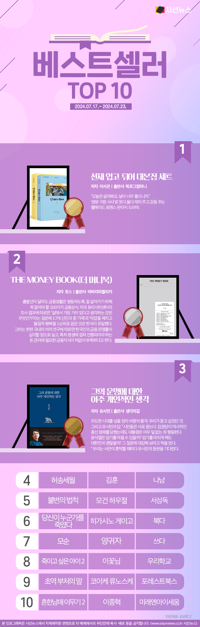 시선뉴스=김선희 proㅣ이번 주에는 어떤 책들이 독자들의 사랑을 받았을까요? 교보문고에서 2024년 07월 17일부터 07월 23일까지 영업점과 인터넷에서 도서와 eBook을 합산해 1주일 간 가장 많이 판매된 책 순위를 발표했습니다.