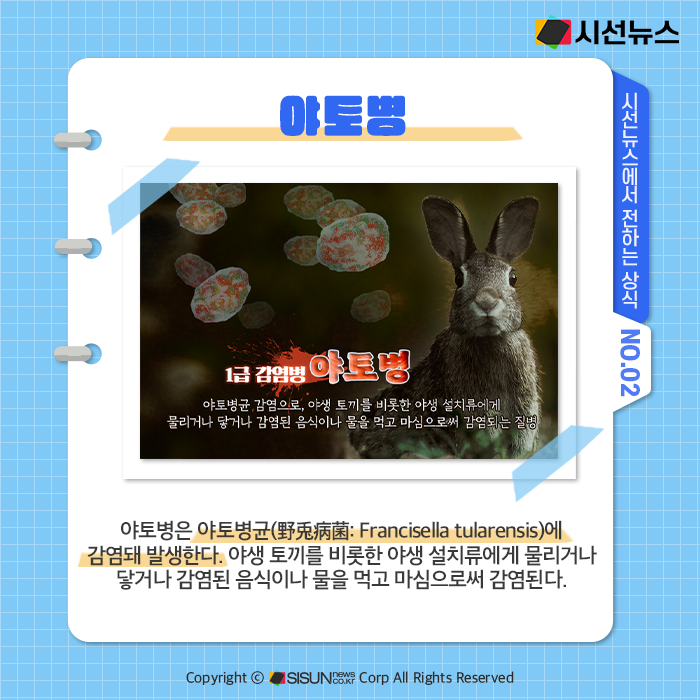 야토병은 야토병균(野兎病菌: Francisella tularensis)에 감염돼 발생한다. 야생 토끼를 비롯한 야생 설치류에게 물리거나 닿거나 감염된 음식이나 물을 먹고 마심으로써 감염된다. 심각도와 전파력이 높은 1급 감염병에는 야토병 외에 에볼라바이러스병, 두창, 페스트, 탄저 등이 지정돼 있다. 야토병은 다만 사람 간에는 전파되지 않아 환자가 발생하더라도 일반 국민 사이에 확산할 가능성은 특히 낮지만, 폐렴이나 혈액을 매개로 감염될 경우 치명률이 높다.