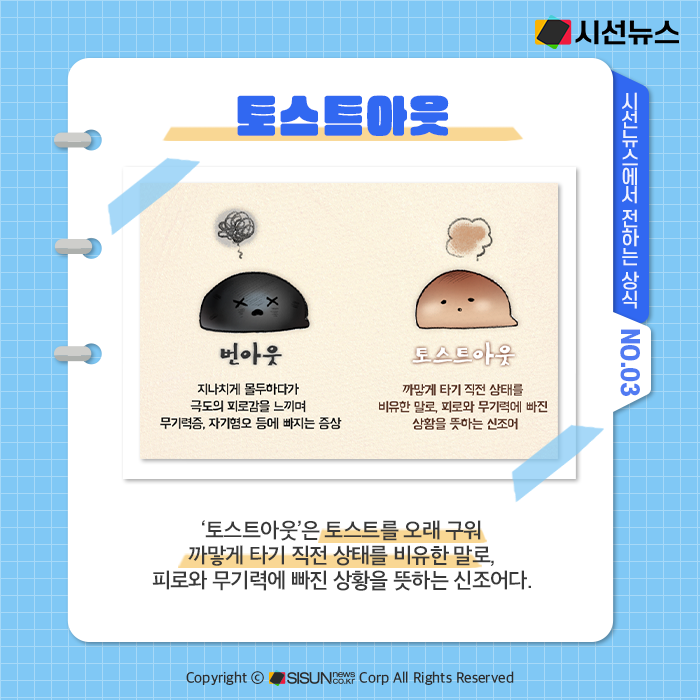 ‘토스트아웃’은 토스트를 오래 구워 까맣게 타기 직전 상태를 비유한 말로, 피로와 무기력에 빠진 상황을 뜻하는 신조어다. 이는 일에 지나치게 몰두하다가 극도의 피로감을 느끼며 무기력증, 자기혐오 등에 빠지는 증상인 ‘번아웃(burn-out)’에서 파생된 말이다. 토스트처럼 다 타버리진 않았지만, 노릇노릇하게 구워진 것 같은 상태에 비유한 표현이다.