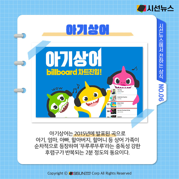 아기상어는 2015년에 발표된 곡으로 아기, 엄마, 아빠, 할아버지, 할머니 등 상어 가족이 순차적으로 등장하며 ‘뚜루루뚜루’라는 중독성 강한 후렴구가 반복되는 2분 정도의 동요이다. 아기상어를 제작한 곳은 ‘스마트스터디’라는 기업으로 유아교육 콘텐츠 브랜드 핑크퐁을 만들었는데 그 브랜드를 달고 2015년 북미권 구전동요를 편곡해 발표한 동요가 바로 ‘아기상어’이다.
