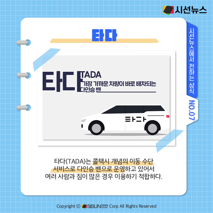 타다(TADA)는 콜택시 개념의 이동 수단 서비스로 다인승 밴으로 운영하고 있어서 여러 사람과 짐이 많은 경우 이용하기 적합하다. 차량 공유 서비스 업체 ‘쏘카’가 운행하고 있으며 ‘타다’ 앱을 설치해 회원 가입 후 이용할 수 있다. 이용 시에는 목적지 입력 후 예상금액을 확인하고 호출해 탑승하면 된다.